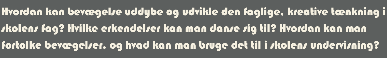 For sammen at blive klogere på hvordan bevægelse kan bidrage til erkendelse af det faglige stof i skolens undervisning, nedsatte vi en gruppe og etablerede et samarbejde med Københavns Professionshøjskole. Samarbejdet mundede i første omgang ud i en rapport om brugen af forskellige bevægelsesformer i en række klasser fordelt over hele landet og siden i en inspirationsbog.